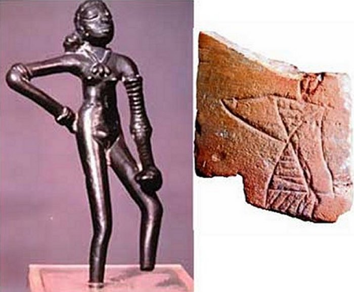 A good example of geographical distance between clearly related objects is the famous bronze “Dancing Girl” found at Mohenjo-Daro, and a sherd of pottery, found at Bhirrana, Haryana, India (about 600 km distant), showing a very similar profile.