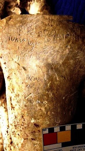 No-one can identify the unknown writing at the bottom of the statue. Image credit: Concordia University
