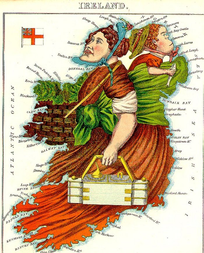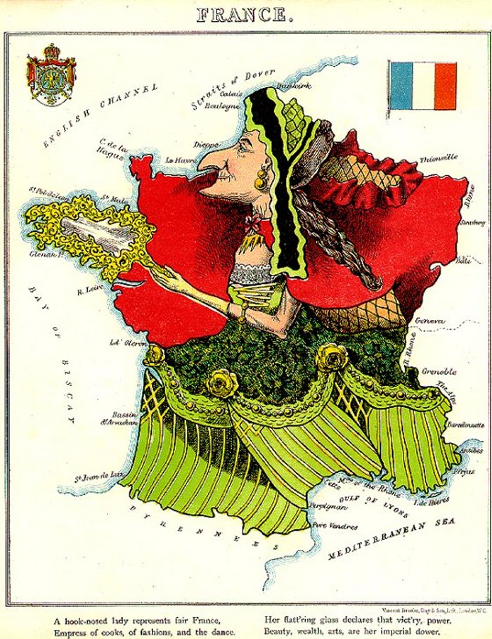 These maps are from Geographical Fun, or Humorous Outlines of Various Countries, published by Hodder and Stoughton in 1869. The author, William Harvey writing under the pseudonym Aleph, created a series of twelve maps showing various countries as curious people in the great tradition of English caricaturists. The idea behind the maps was taken from sketches drawn by a fifteen-year-old girl wishing to amuse her sick brother confined to bed.
