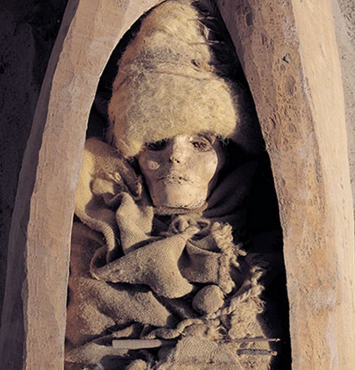 The oldest corpse is an old man who died 1500 years ago, the youngest a tiny baby in a bonnet, with blue stones covering its eyes. With their European origins, there were very likely many blue-eyed people among travelers.