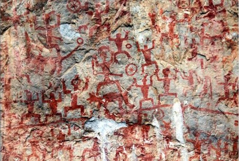 Rock Paintings of Hua Mountain, located on a cliff face along the west bank of the Mingjiang River in Yaoda Town, Ningming County, Guangxi, China. Image credit: Rolfmueller - CC BY-SA 3.0