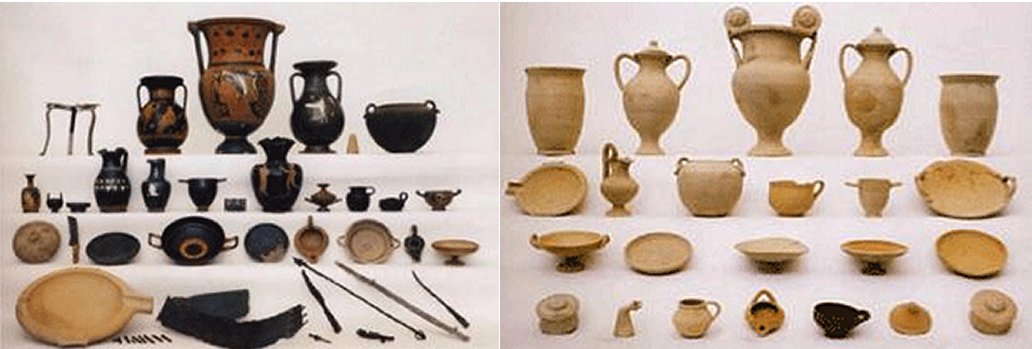 Left: A 4th century assemblages with fine Greek vases, banquet implements and metal weapons. Right: Generic and symbolic ceramic assemblages from early 3rd century BCE. Source/Riccardi 2003.