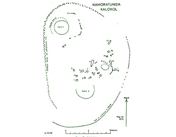 At Namoratunga II, one setting of upright stones encircles an ancient grave, like those at Namoratunga I, according to research conducted in the area by anthropologists at Michigan University, B. M. Lynch and L.H. Robbins.