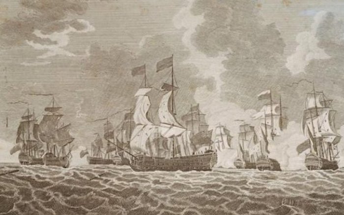 An engraving shows the Namur (center) fighting in the 1759 Battle of Lagos, a critical incident in the Seven Years' War Credit: National Maritime Museum