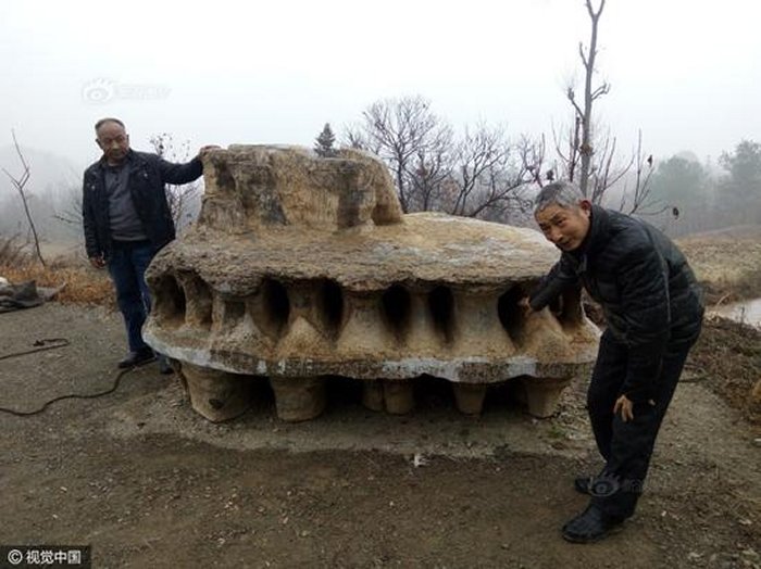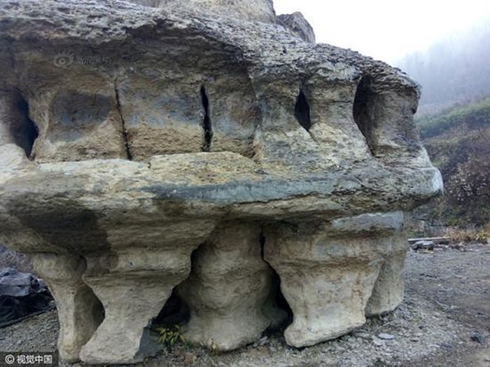 The bizarre rock was found in a mountain village in the Hubei Province in central China. Xia Changjun, a villager at Baokang county spotted a piece of rock sticking up from the ground and he decided to take a closer look. He noticed the stone had multiple holes and something that looked like pillars.