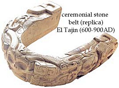 Ceremonial stone belts are representations of represent the padded belts made of leather, padded cloth or other textiles and worn by players to protect their hips. Other protection made of jaguar skin or deer) was for the head, knees, hips and elbows.