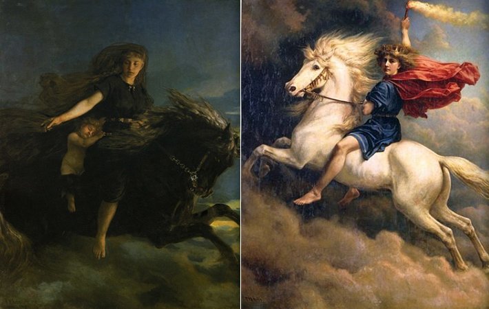 Left: Nott riding Hrimfaxi By Peter Nicolai Arbo (1831–1892), Right: Dag riding Skinfaxi - By Peter Nicolai Arbo (1831–1892)