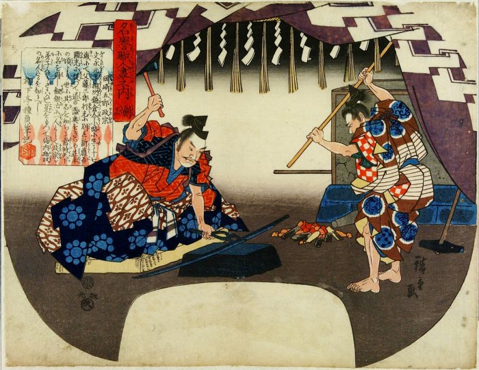 Masamune forges a katana with an assistant (ukiyo-e). Image credit: Celestial Sentinel - Public Domain