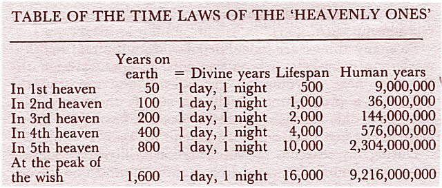 "In the heaven of the four Great Kings 50 terrestrial years correspond to a day and a night. The lifespan is 500 years, or nine million years if one counts in terrestrial years.