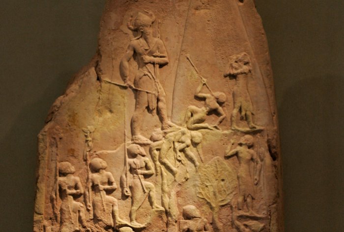Victory Stele of Naram-Sin,celebrating victory against the Lullubi from Zagros 2260 BC. He is wearing a horned helmet, a symbol of divinity, and is also portrayed in a larger scale in comparison to others to emphasize his superiority. Brought back from Sippar to Susa as war prize in the 12th century BC. Credit: Public Domain