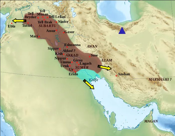 The Akkad empire during the reign of Narâm-Sîn (2254-2218 BC). Mount Damavand is labelled in blue. Zunkir / Semhir / wiki, CC BY-SA