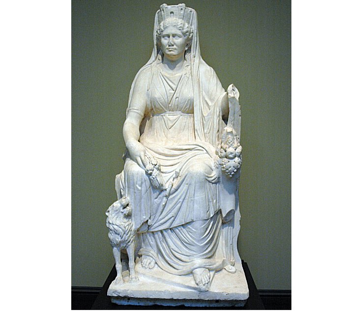 Cybele enthroned, with lion, cornucopia, and mural crown. Roman marble, c. 50 AD. Getty Museum