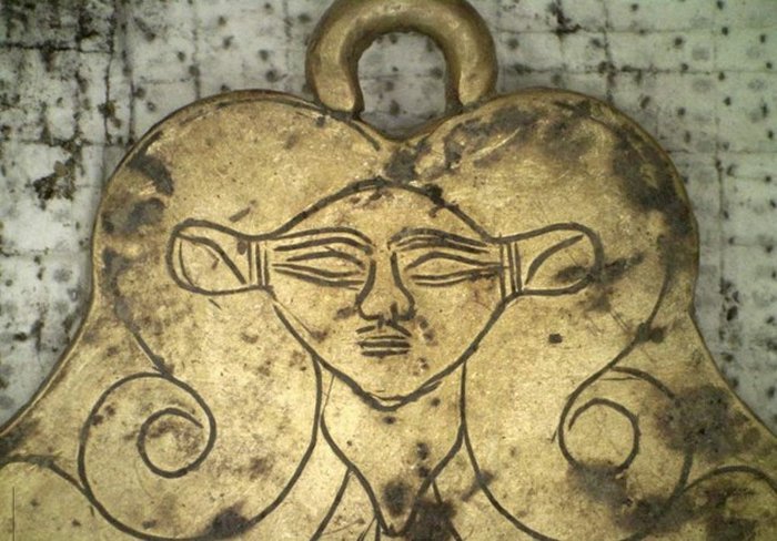 A golden pendant of the Egyptian goddess Hathor is seen that was found in a 3,500-year-old tomb unearthed near the southwestern Greek town of Pylos. Image credit: Greek Culture Ministry/AP