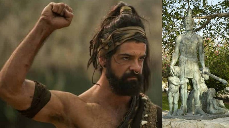 Left: A movie was made about the incredible life of Gonzalo Guerrero - Image source - Right: Statue by Raúl Ayala Arellano in Akumal, Quintana Roo commemorating Gonzalo Guerrero - Credit: Public Domain