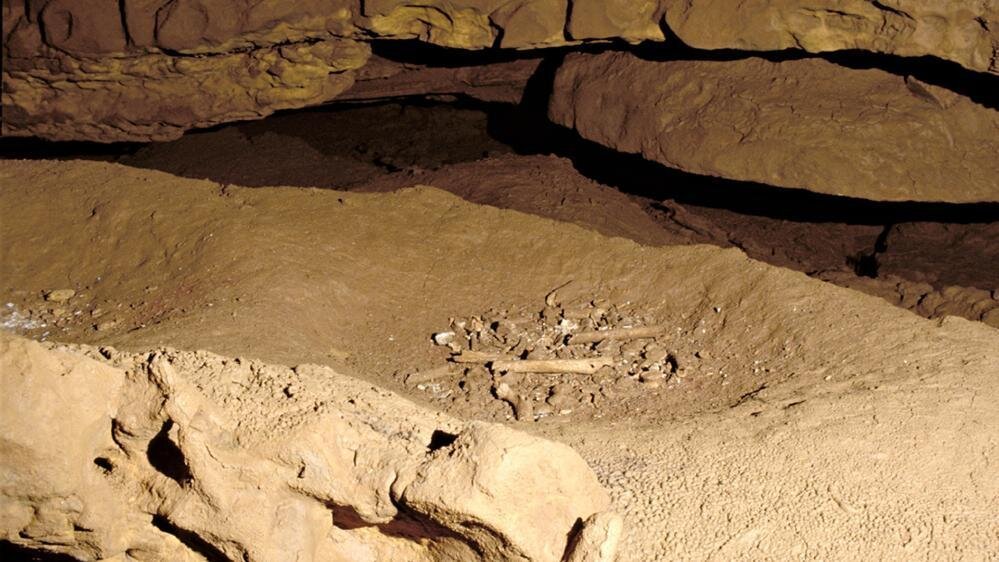 The human remains were found in three locations within the cave and had been deliberately placed in former bear hibernation nests (long after bears stopped using the cave), a practice that hadn’t been documented before. In two of the sites, the bear nests (which form hollowed areas on the cave floor) show signs of being covered with red ochre before the remains were placed there.