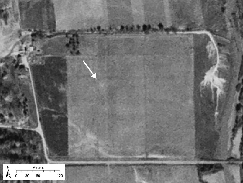 Vertical panchromatic air photo of Gast Farm, October 1949. Mound location indicated by light-colored soil (arrow). Source: Photo A000700080454, Army Map Service; U.S. Geological Survey 2020