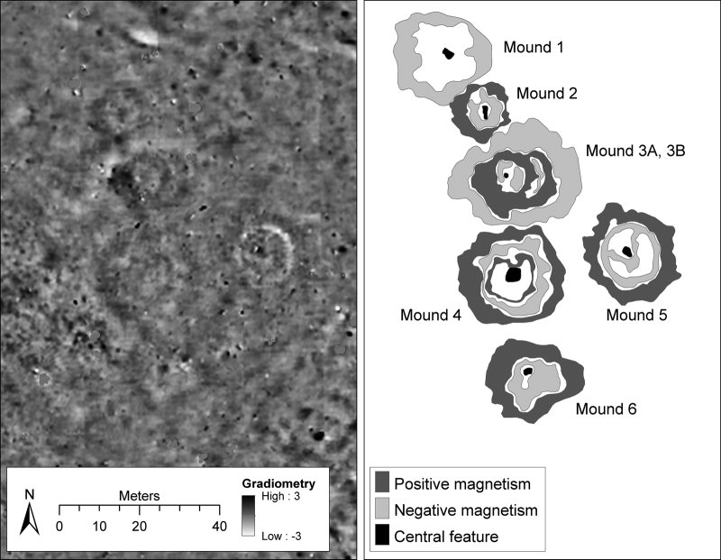 Magnetic gradiometry results (left) and interpretations (right) of the Gast Farm mound group. Credit: Green, W., Wiewel, A., & De Vore, S.