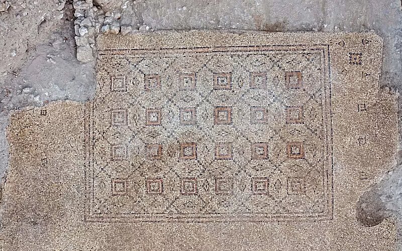 The multicolored mosaic pavement dates back to the Byzantine period (4th -5th century CE) was unearthed in archaeological excavations directed by Avishag Reiss of the Israel Antiquities Authority. The floor is decorated with colorful geometric motifs and has a black rectangular frame.