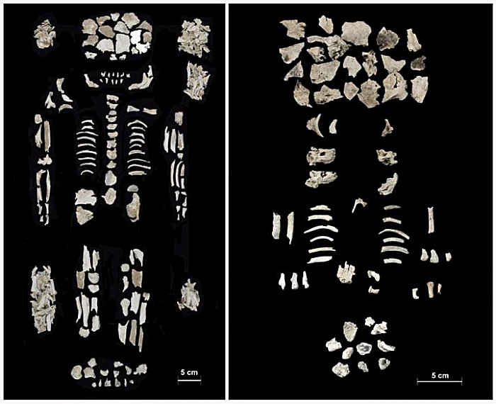 Left: Bone assemblage from burial n. 241a (adult female individual). Right: Bones attributable to both fetuses (n. 241b and 241c). Credit: Cavazzuti et al, 2021, PLOS ONE (CC-BY 4.0)