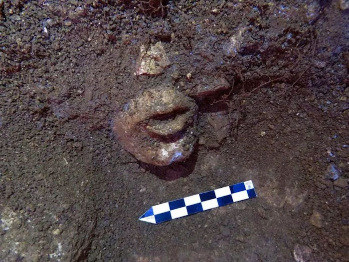 The god's head was found inside "a semi-square receptacle formed by three walls and, under a layer of loose earth, the nose and half-open mouth of the divinity emerged."