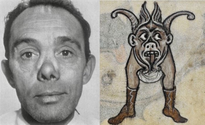 A gryllus displaying the saddle nose deformity in a drawing from the early 1300s. Credit: L: British Journal of Plastic Surgery, Vol. 10, McLaren + Penney, The reconstruction of the syphilitic saddle nose: A review of seven cases, Pages 236-252, Copyright 1957–1958. R: The Maastricht Hours, Liège, early 14th century. British Library, MS Stowe 17, fol. 151r.