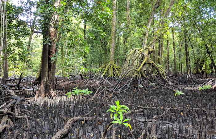 A mangrove forest on the island of Kosrae, Federated States of Micronesia. These mangrove forests have been growing on the coastline of Kosrae for at least 5,000 years, keeping pace with rising sea level. Credit: Juliet Sefton