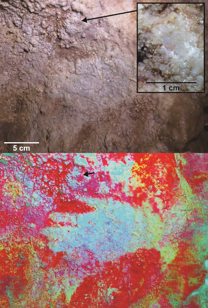 Red pigment washed into the concavities of a bright stalactite drapery in Ardales Cave. Paul Pettitt and cave art dating team, Author provided