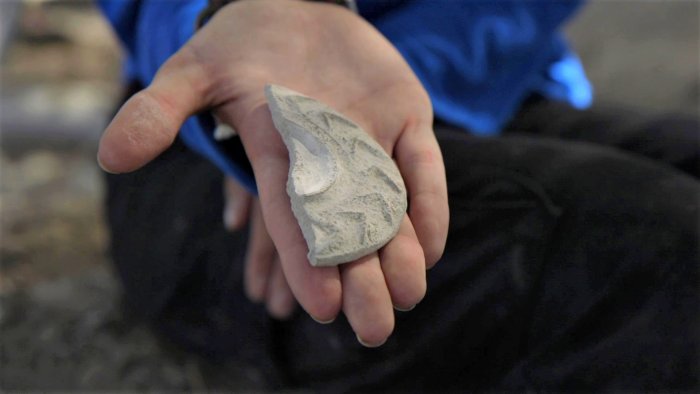 One of the students was Aviv Weizman, 17, who suddenly spotted a mysterious ancient when the team excavated an area in Usha, near Kiryat Ata, a city in Israel's Haifa District. Aviv noticed an unusual pottery sherd that peeped out of the ground between the walls of a building. Aviv uncovered the sherd, picked it up, and showed it to Dr. Einat Ambar-Armon, Director of the Israel Antiquities Authority Northern Education Center, who recognized the find as the plaque of a magical mirror.