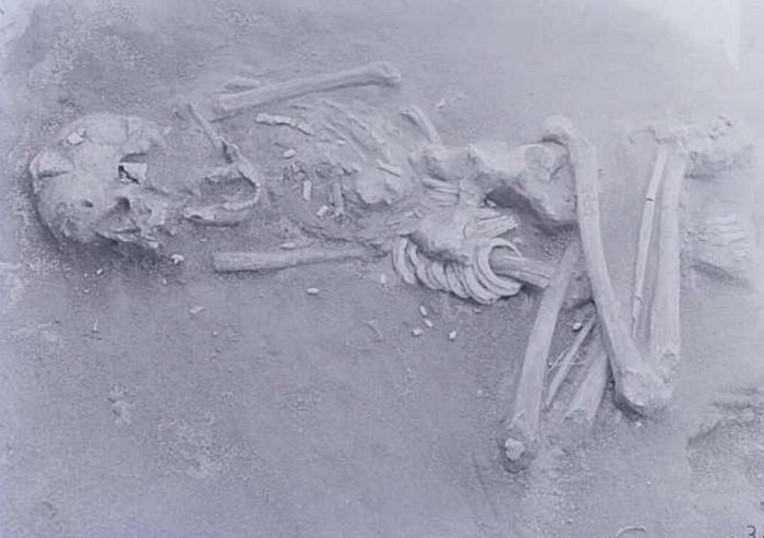 A photograph of the ancient human remains found at the Hirota ruins. A notable characteristic of the remains is the wearing of many shell accessories, indicative of the culture and trade of the region at the time. Credit: The Kyushu University Museum