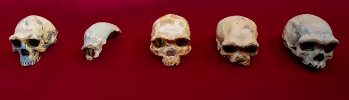 Fossil human skulls from China. Home erectus (Peking Man) is to the left, with examples of the recently defined Homo longi lineage to the right. The Harbin cranium is the last to the right. Kai Geng