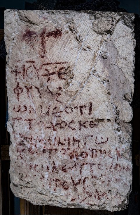 Over the course of excavation, a sizeable building stone was discovered lying on the plastered floor of the hall, bearing lines of text painted in red, with a simple cross at its peak. Haber and Gutfeld immediately recognized the inscription as written in Koine Greek—the language of the New Testament—but called on their colleague, expert epigraphist Dr. Avner Ecker of Bar-Ilan University, to decipher it.