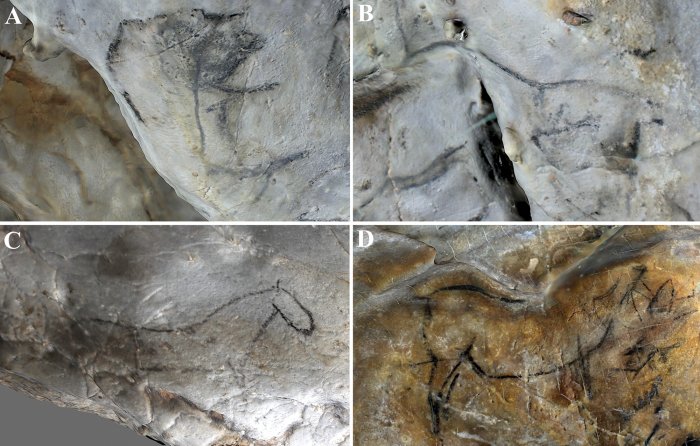 Ortho-images (orthorectified image accounting for distortions in the topography of the cave wall) of depictions that are simple in style and have a strong relationship to topographic features of the cave wall from Las Monedas. (A) depiction 5; (B) depiction 8; (C) depiction 12; (D) depiction 30. Credit: Cambridge Archaeological Journal