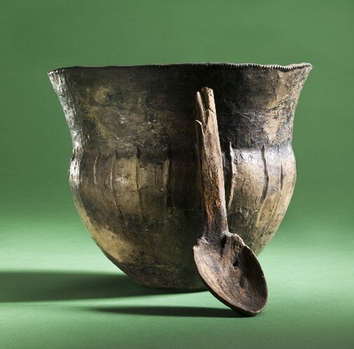 Early Neolithic bog pot from Olvig Mose and wooden spoon from Tømmerup in Åmosen, Denmark. Credit: Arnold Mikkelsen, The National Museum of Denmark, CC BY-SA