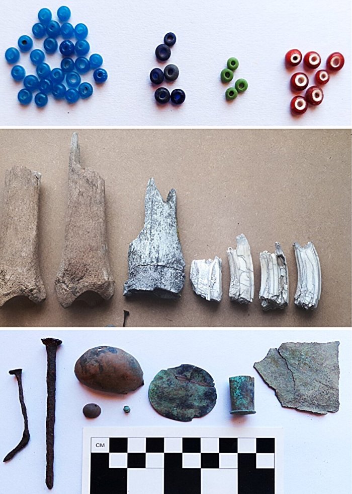 Artifacts found at the Chorrillo Grande 1 site include Venetian glass beads (top), horse bones and teeth (middle) and metal artifacts including nails and ornaments (bottom). Credit: Juan Bautista Belardi