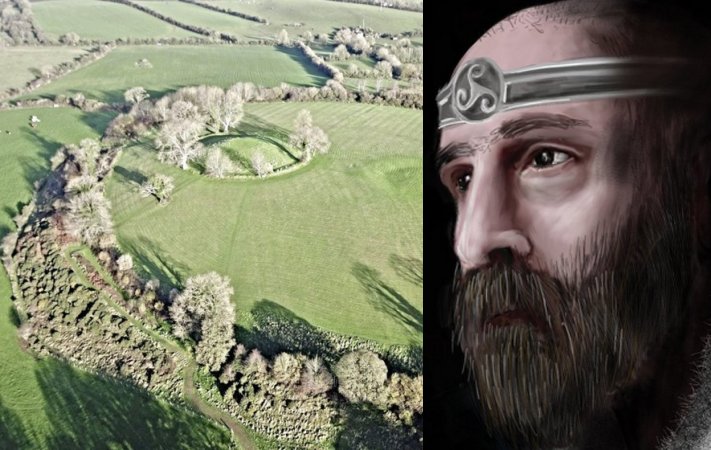Izquierda: Fuerte Navan en Co Armagh. Crédito: Irish News-Derecha: Ailill macMata, uno de los reyes del Ulster. Crédito: artista irlandés Cormac McCann, CC BY-SA 3.0
